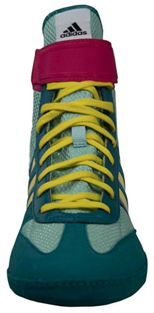 Put your opponents on the defensive from the start of the match in the adidas Combat Speed 5. The original competition wrestling shoe. The “Speed” is the standard to which all other wrestling shoes are judged. Sock-like fit meets uncanny support in this ultra-lightweight shoe. Mesh breathability and TPU stripe support. A single layer mesh upper offers enhanced breathability while a split-suede outsole provides you with maximum traction and performance during matches. Color: Teal/Aqua/Pink/Yellow. G25907