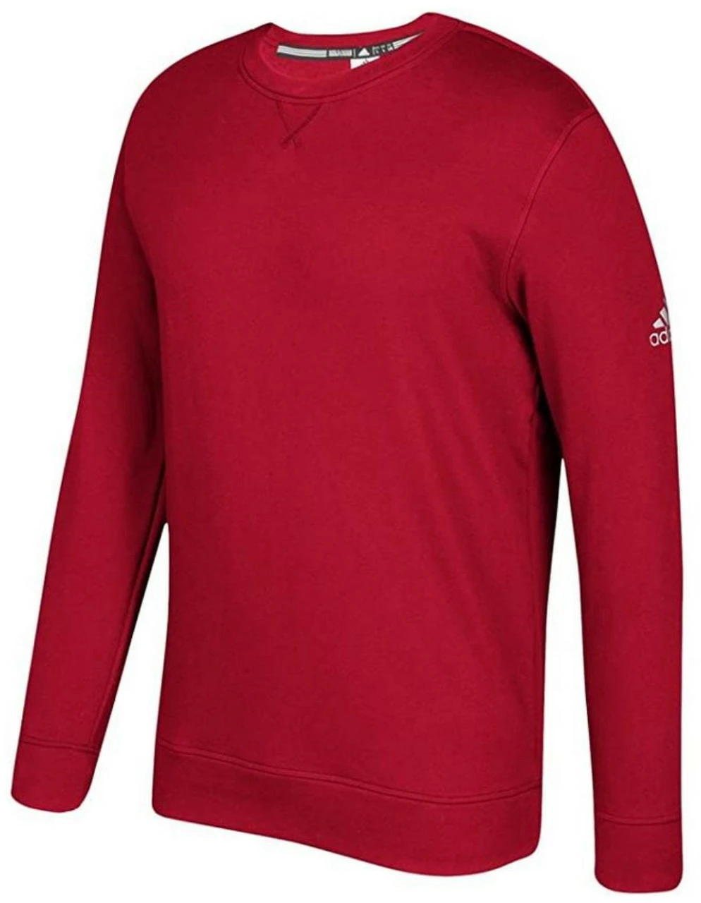 Adidas Men’s Essential Fleece Pullover Crew Neck Sweatshirt � Power Red/White, S97356. As temperatures start to drop, this sweatshirt keeps you warmed up in soft fleece. The relaxed shape comfortably layers over your workout clothes. Sweat-wicking fabric helps you stay comfortable wherever the day takes you. This crew neck sweater features long sleeves with banded cuffs and a relaxed fit that drapes at the shoulders for total comfort. The sweat-wicking Climalite fabric makes this sweater perfect for layering during workouts or just lounging around the house! Made from 70% cotton and 30% polyester fleece.