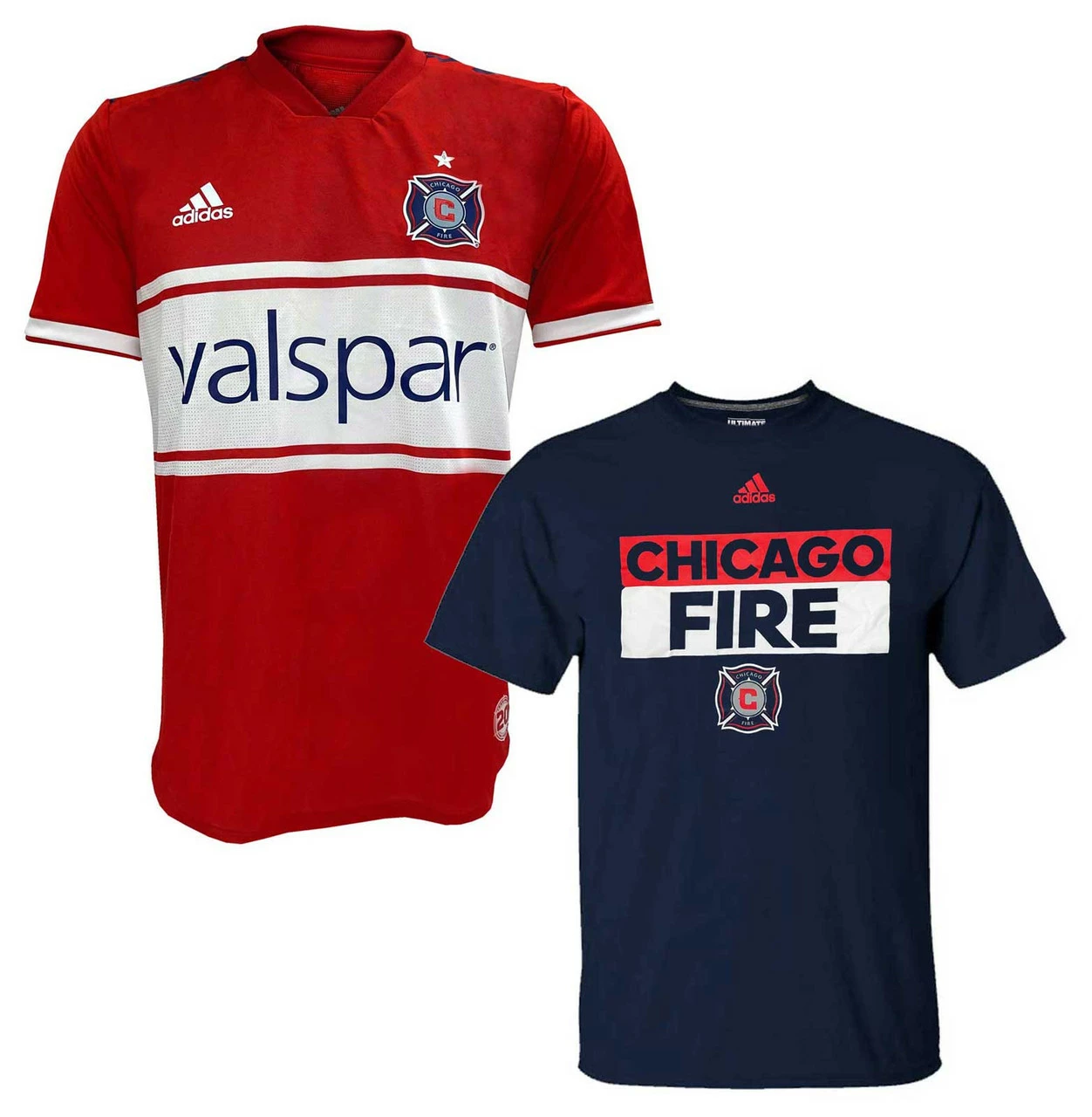 Adidas Men’s Chicago Fire MLS 2 Pack of Soccer Shirts. Perfect for the Chicago Fire show fans in addition to Chicago Fire Major League Soccer. One is a classic style sport jersey with ventilation holes and Chicago Fire and Valspar logos. Second is a tee in Navy, both with blank backs. Officially licensed by the MLS. ChicagoFire3