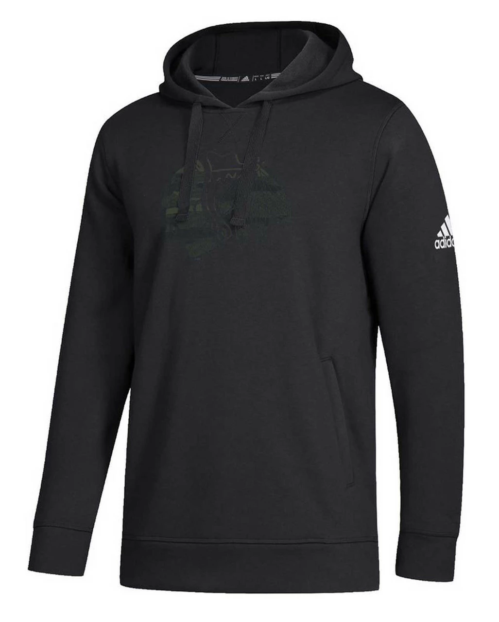 This Adidas Chicago Blackhawks Salute to Service Hoodie Sweatshirt is perfect for any hockey event. Built to keep you comfortable and stylish. Quality Made of 23% Polyester, 77% Cotton with a cozy soft fleece interior. Large distressed screen print team design on the front of the sweatshirt, blank back and nice embroidered Adidas logo on the left bicep and embroidered flag detail on right bicep. Officially licensed by the NHL. Color: Black/Green/Gray. GT5332