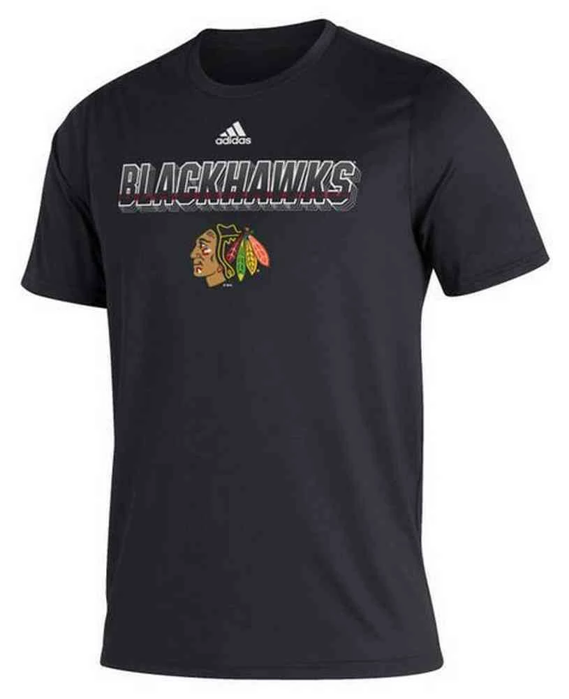 Adidas Men’s NHL Chicago Blackhawks Team Color Creator Short Sleeve T-Shirt, HN6447. Extremely soft and lightweight tee, made from 100% polyester. Screen printed old school Blackhawks logo on front accented with shiny silver print. Adidas logo on sleeve. Officially licensed by the NHL. Comfortable crew neck fit.