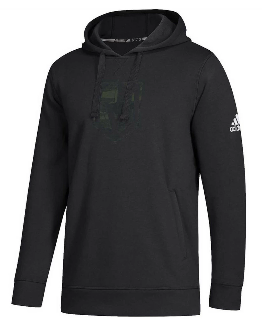 This Adidas Las Vegas Knights Salute to Service Hoodie Sweatshirt is perfect for any hockey event. Built to keep you comfortable and stylish. Quality Made of 23% Polyester, 77% Cotton with a cozy soft fleece interior. Large distressed screen print team design on the front of the sweatshirt, blank back and nice embroidered Adidas logo on the left bicep and embroidered flag detail on right bicep. Officially licensed by the NHL. Color: Black/Green/Gray. GT5327