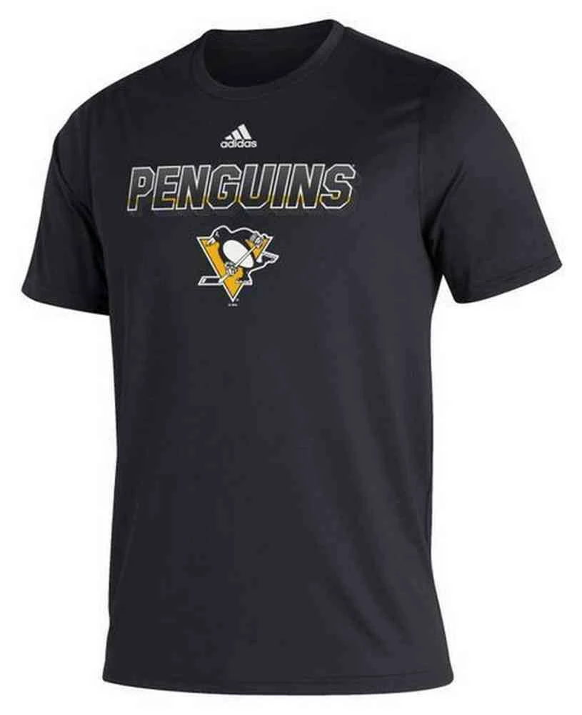 Adidas Men’s NHL Pittsburgh Penguins Team Color Creator Short Sleeve T-Shirt, HN6462. Extremely soft and lightweight tee, made from 100% polyester. Screen printed old school Penguins logo on front accented with shiny silver print. Adidas logo on sleeve. Officially licensed by the NHL. Comfortable crew neck fit.