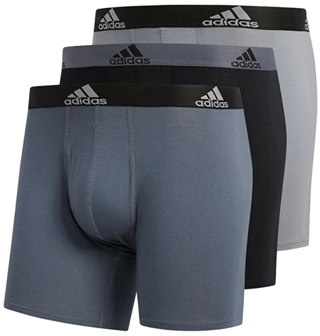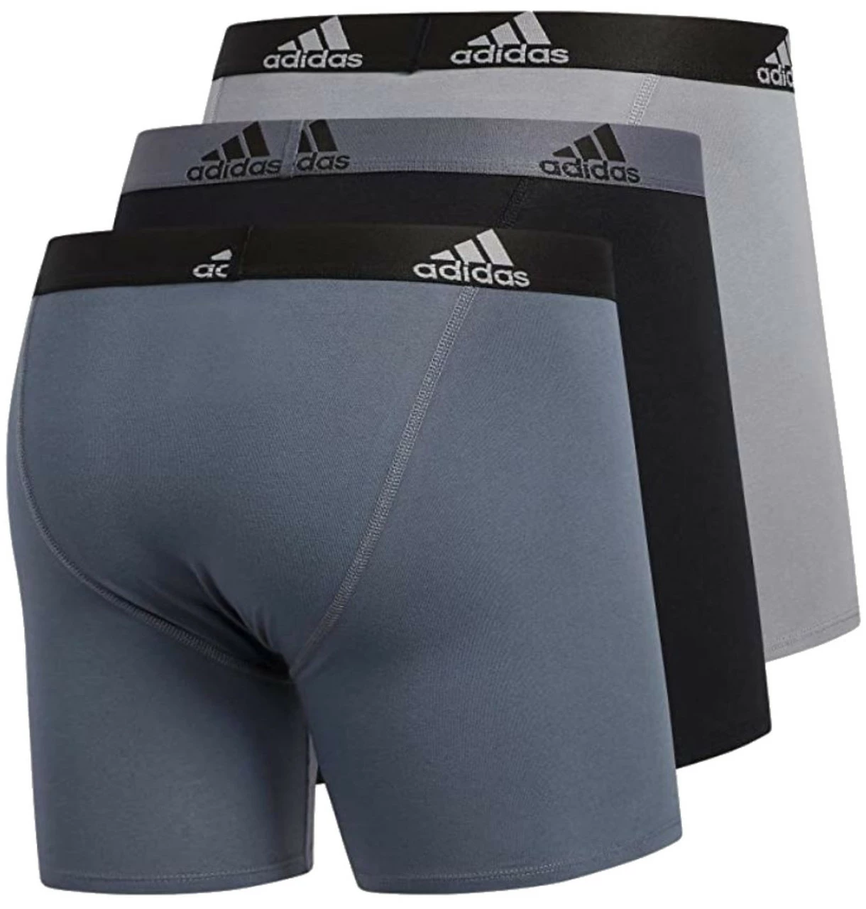 Adidas Men’s Stretch Cotton Boxer Brief Underwear (3-Pack) � Onix Grey/Black/Grey, 5152377. The ultimate in everyday comfort with a performance edge, Adidas Stretch Cotton 3-Pack underwear features our proven soft, moisture-wicking stretch cotton fabric, an easy fit through the pouch, functional no-gap fly, soft stitching, tagless waistband and no-ride-up construction. Made from 57% cotton, 38% polyester and 5% spandex