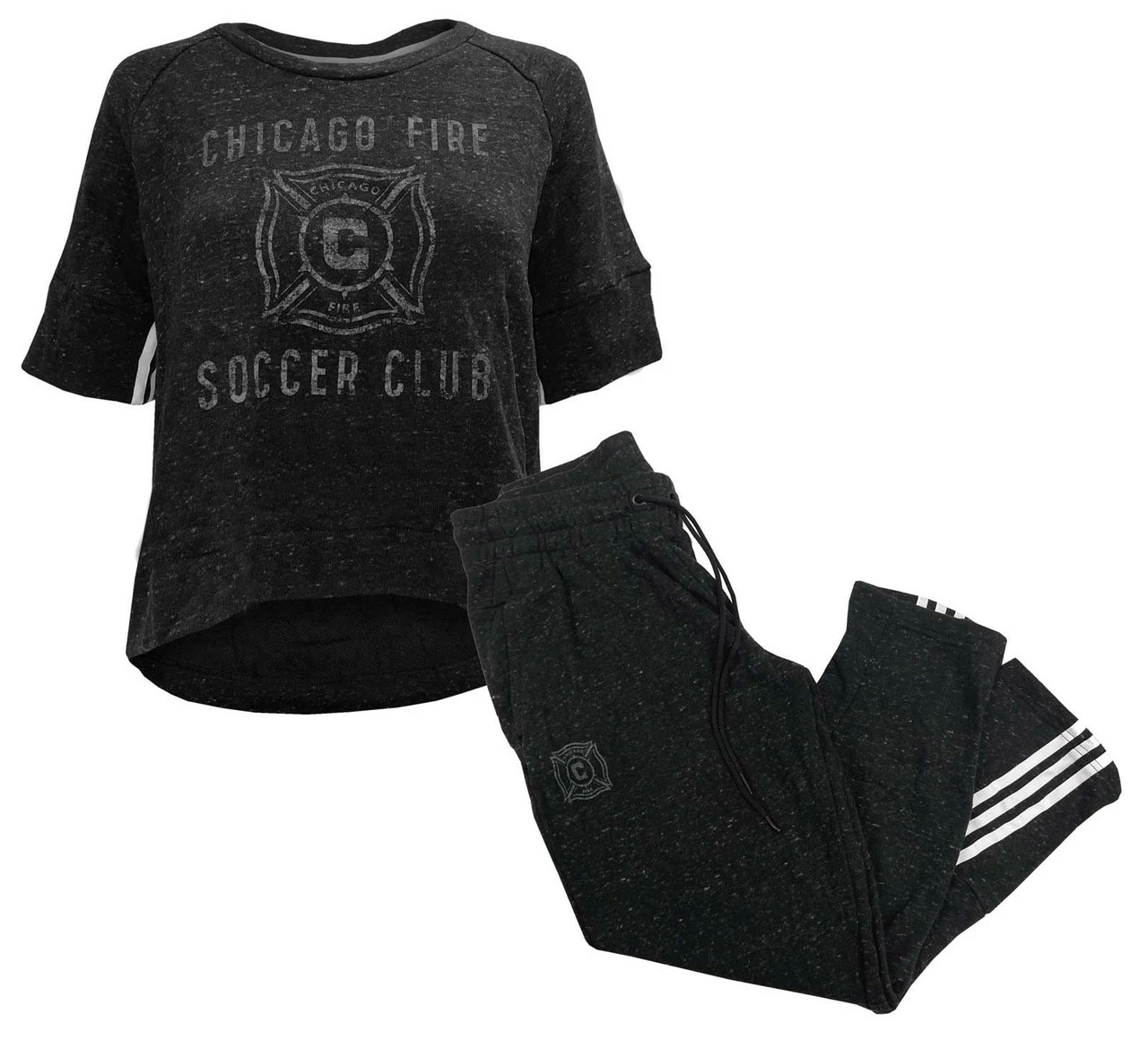 Adidas Women’s Chicago Fire Major League Soccer 2 piece crop top sweatpant sweatsuit. Represent your team like the loyal fan you are. Super soft 100% Cotton fabric with flecks. Distressed team logo graphic on front and striped arm detail on top. Officially licensed by the MLS. ChicagoFire7