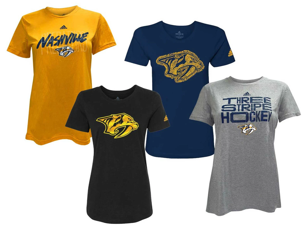 Adidas Women’s Nashville Predators NHL Hockey 4 pack of Tees. All 4 are short sleeved. Have the flexibility to choose your tee based on the game day weather. Gold and Grey tee are made from 100% polyester. Navy and Black tees are made of 100% Cotton. Officially licensed by the NHL. Predators1