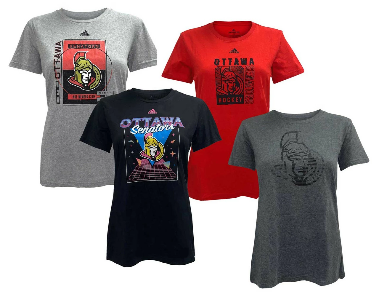 Adidas Women’s Ottawa Senators NHL Hockey 4 pack of Tees. All 4 are short sleeved. Have the flexibility to choose your tee based on the game day weather. The Black and heather gray tees are made from 100% polyester. Red and Gray tees are made of 100% Cotton. Officially licensed by the NHL. Ottawa1