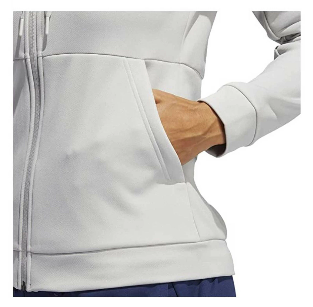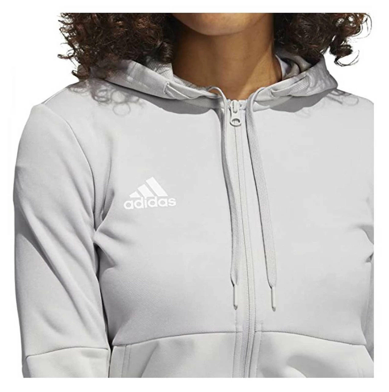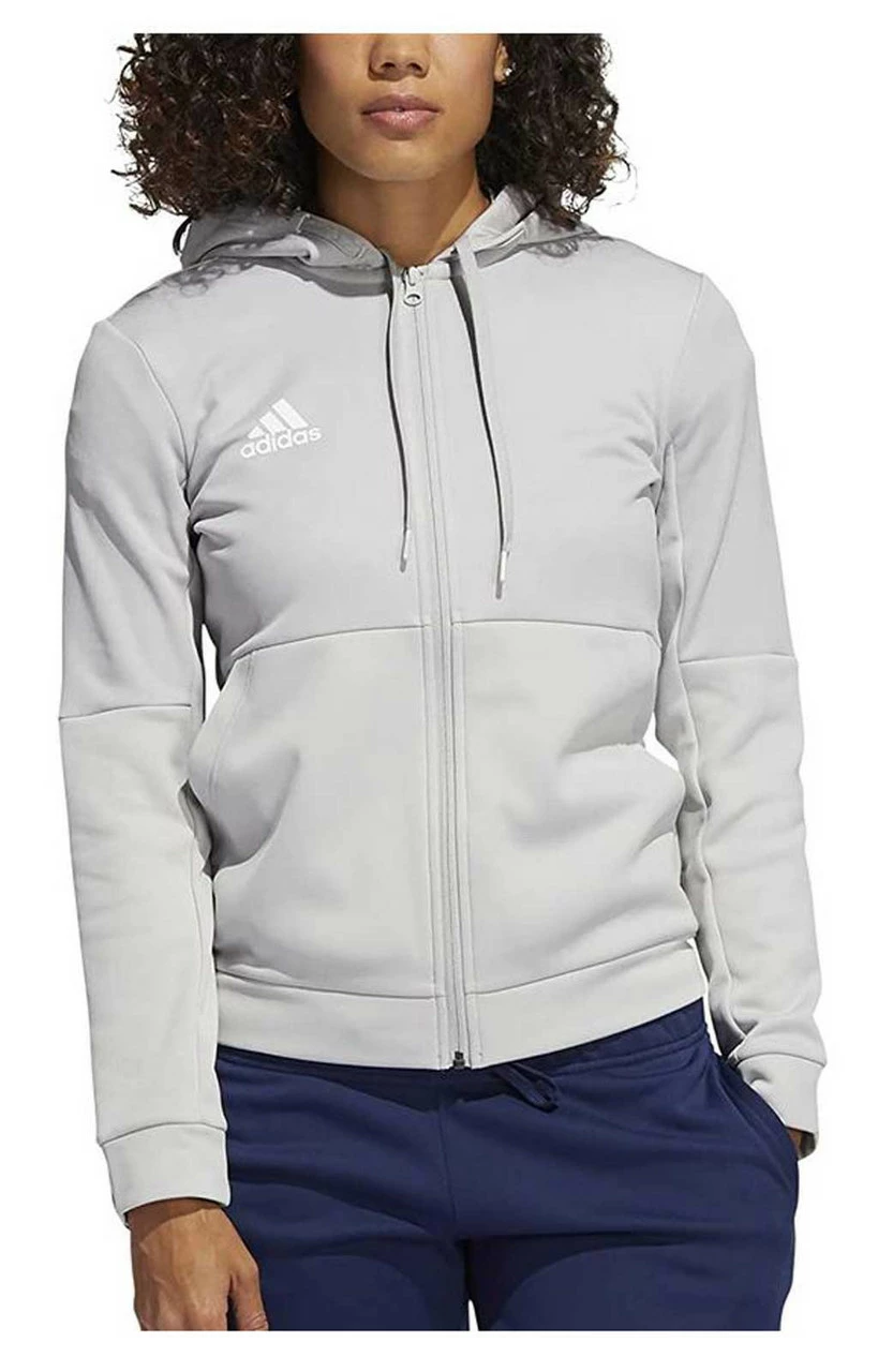 Adidas Women’s TI FZ Jacket – Gray/White, FQ0184. Made from 72% recycled polyester and 28% double knit polyester. Features two front pockets. Hood adjustable with drawcord. Rubberized high density print adidas logo on front. AEROREADY adsorbs moisture and makes you feel dry.