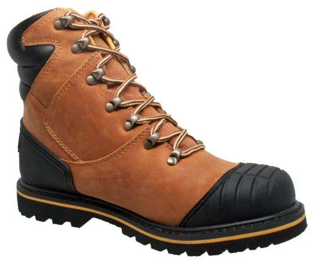 Heavy duty work boot from AdTec. Featuring Crazy Horse Leather; Oil, Slip & Acid Resistant Outsole, Steel Toe w/ Rubber Toe Cap, and Reflective Safety Trim on Heel. Color: Light Brown. 9804