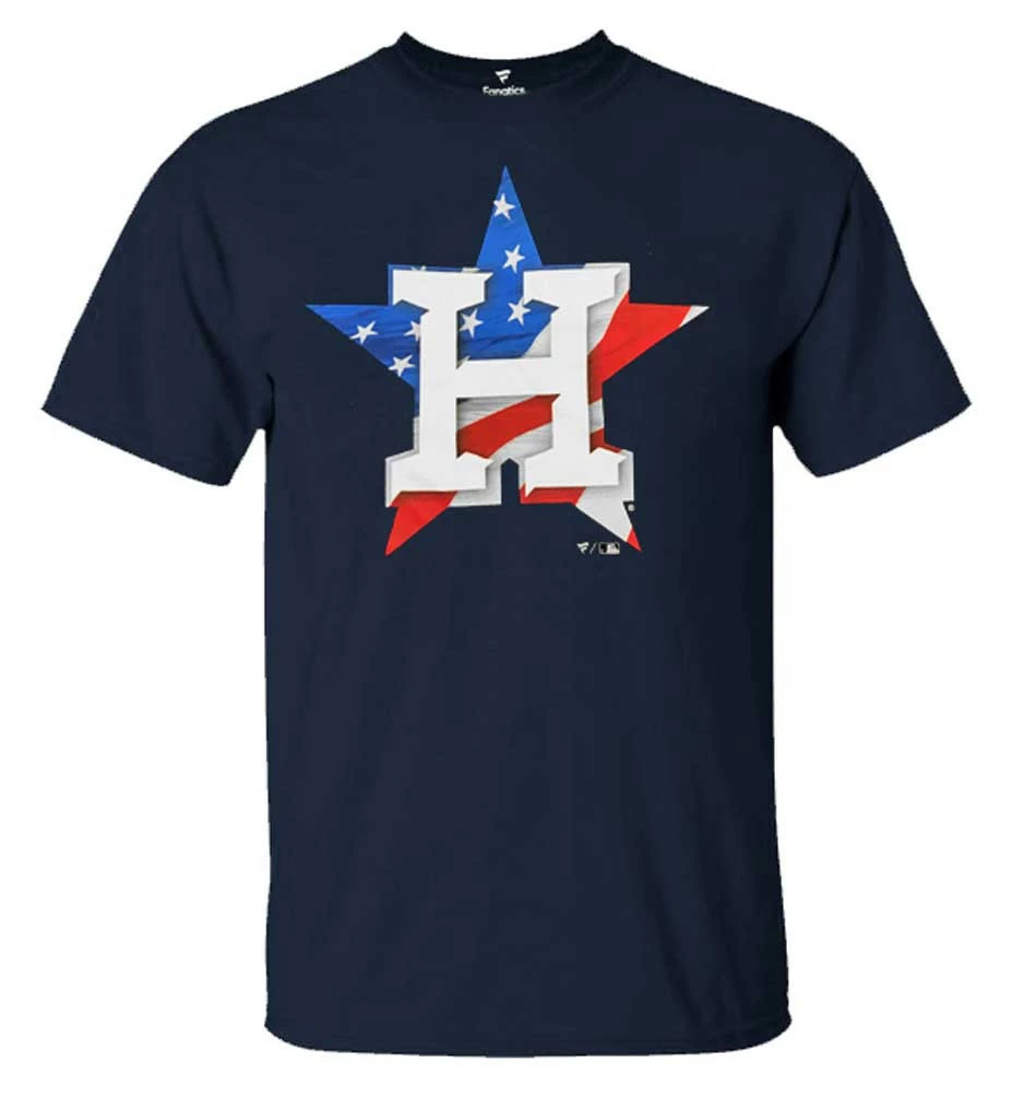 Time to get ready for the Houston Astros season with this Short Sleeve BannerWave tee from Fanatics. Add this soft and comfortable short sleeve t-shirt to your collection and you’ll always be ready to support your Houston Astros. Large Patriotic Flag Banner Team Logo across the front. Fanatics brand tee made of 100% Preshrunk Cotton. Officially Licensed by MLB. Color: Navy. QF6E-4506-HUS-5A7