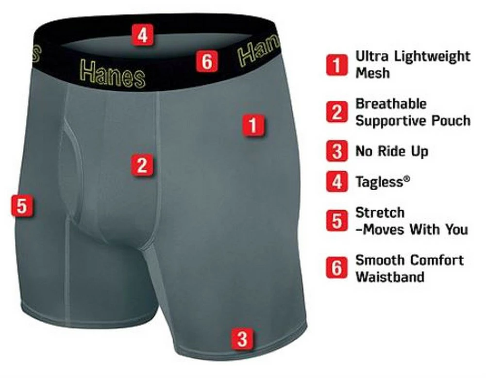 Hanes has created a performance engineered fit mens underwear for all to feel confident in. Made with ultra lightweight breathable mesh for all day comfort. FreshIQ? advanced odor protection technology attacks the odor-causing in your clothing that causes your underwear and socks to smell ? so now you can feel fresh all day. Cool Comfort? wicking fabric keeps you cool for all day comfort. Soft, stretchable Comfort Flex? waistband moves with you and keeps its shape wash after wash. Material: 87% Polyester, 13% Spandex. Color: 2 Blacks, 1 Gray. CFFSP3