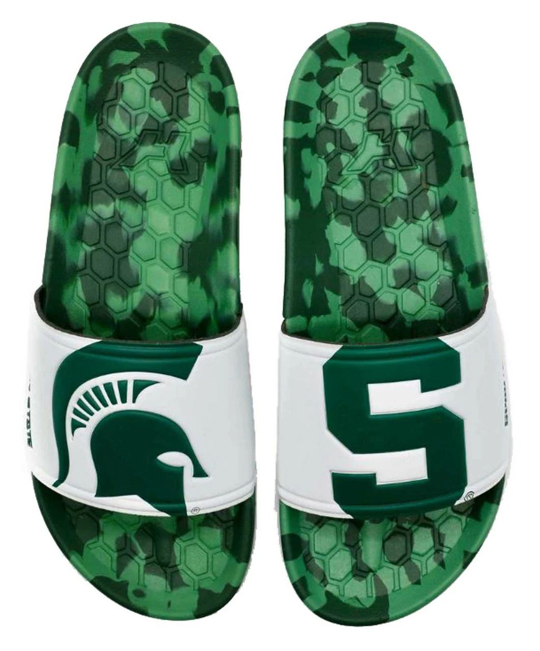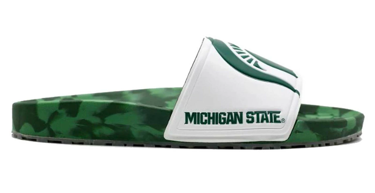HYPE Michigan State University Spartans Slide Sandals – Green/White, HCSLD.MSU. Custom made for each University and packed with intricate details that allows fans to proudly showcase their University without sacrificing quality and comfort. Incredibly soft, multi-color insoles made custom for each school. Built for soft landings with each footstep that keep you going from tailgate, to game time, to post-game celebration with ease. Long-lasting rubber outsoles featuring repeating logos to leave your mark everywhere you walk. Built to last this winning season and the next and the next and the next. These shoes will only wear out when you get tired of your team. Premium materials, construction, and fit to carry you everywhere your passions take you. Many hours, fit tests, and redesigns have gone into making sure this design fits in all the right places all the time. We made sure the strap stretches just right and the sole forms along all the curves.