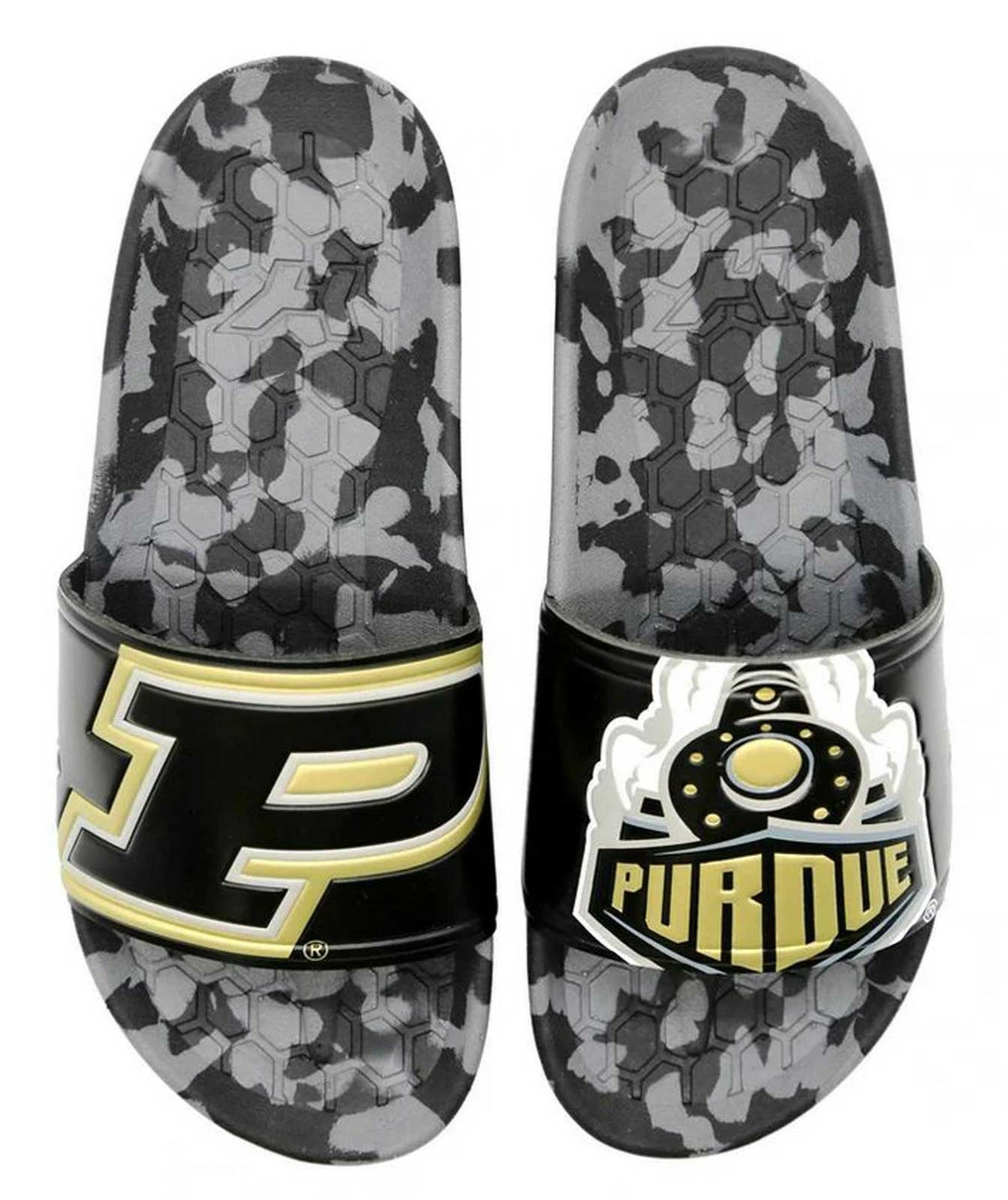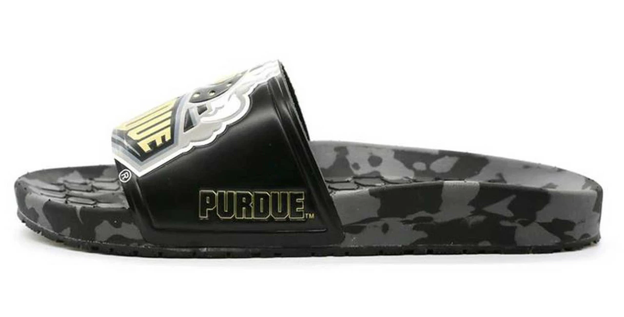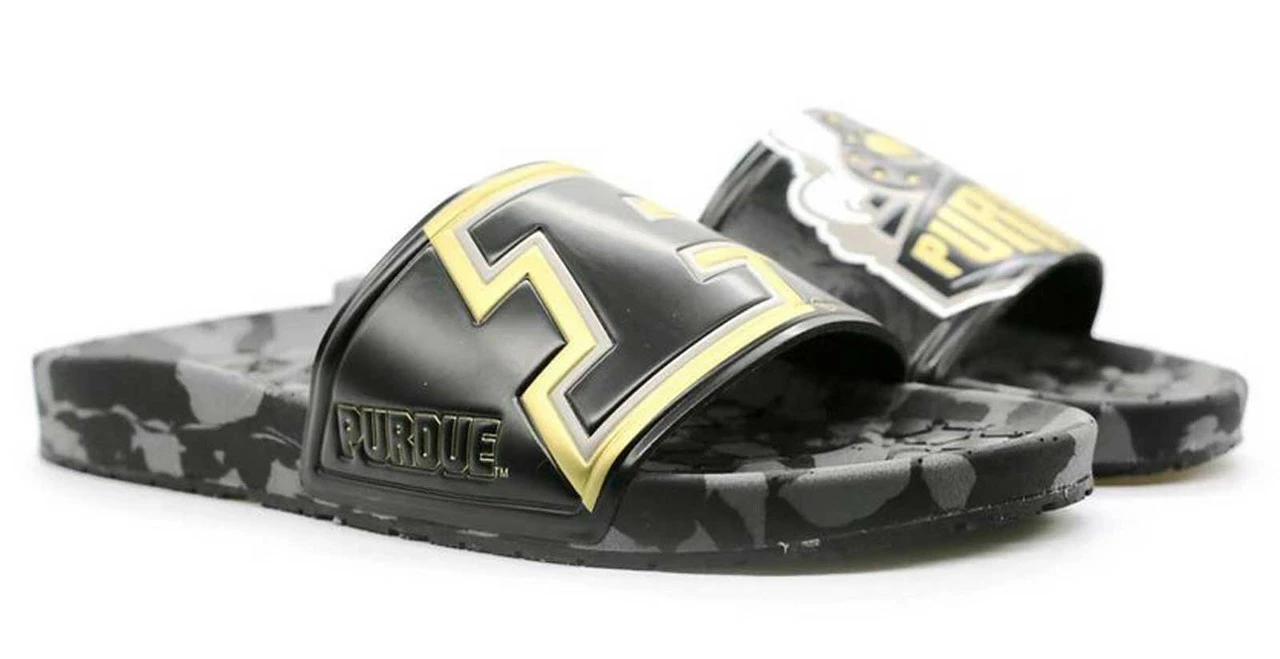 HYPE Purdue University Boilermakers Slydr Slide Sandals – Black/Old Gold/Gray, HCSLD.PUR. Custom made for each University and packed with intricate details that allows fans to proudly showcase their University without sacrificing quality and comfort. Incredibly soft, multi-color insoles made custom for each school. Built for soft landings with each footstep that keep you going from tailgate, to game time, to post-game celebration with ease. Long-lasting rubber outsoles featuring repeating logos to leave your mark everywhere you walk. Built to last this winning season and the next and the next and the next. These shoes will only wear out when you get tired of your team. Premium materials, construction, and fit to carry you everywhere your passions take you. Many hours, fit tests, and redesigns have gone into making sure this design fits in all the right places all the time. We made sure the strap stretches just right and the sole forms along all the curves.