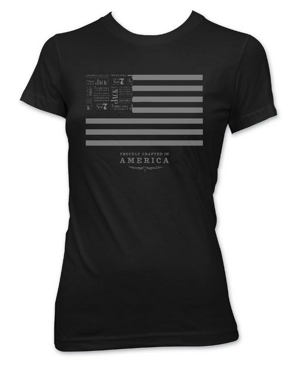 Jack Daniels Ladies Jack & Stripes Black Short Sleeve Tee T-Shirt 15361501JD-89. When she’s a Whiskey Women! Show your love for your country and your favorite brand simultaneously with this shirt from Jack Daniels. This shirt is made with 100% cotton, has a crew neck, and a Jack flag design with “Proudly Crafted in America” on the front. This shirt will quickly become one of your favorites. Show pride in the things you love with this shirt from Jack Daniels. Color: Black/Gray. 15361501JD-89