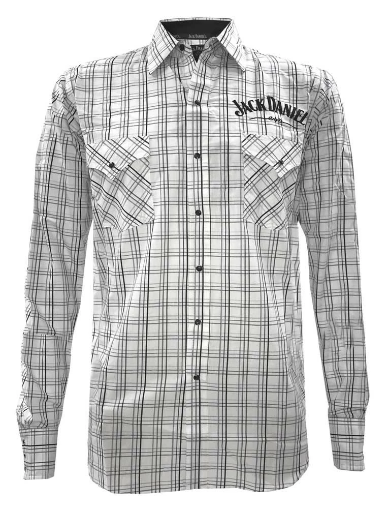 Jack Daniels Men’s Ely Long Sleeve Plaid Logo Embroidery Western Shirt. Western shirts are no longer just for the country boy anymore! Plaid and western shirts are completely in fashion as of late. Show your love for Tennessee Whiskey and stand out at the same time! This Jack Daniel?s Logo Embroidered Plaid Long Sleeve Shirt is both comfortable and fashionable. This handsome shirt has classic black and white plaid with Jack Daniel?s logo proudly stitched on the chest, sleeve, and back yoke. Snap button down front with snap flap pockets and a classic black snap triple placket cuff. Great dressed down with your working jeans and boots or dressed up with khakis or dress jeans. Color: Whites/Blacks Plaid. 15203936JD-89