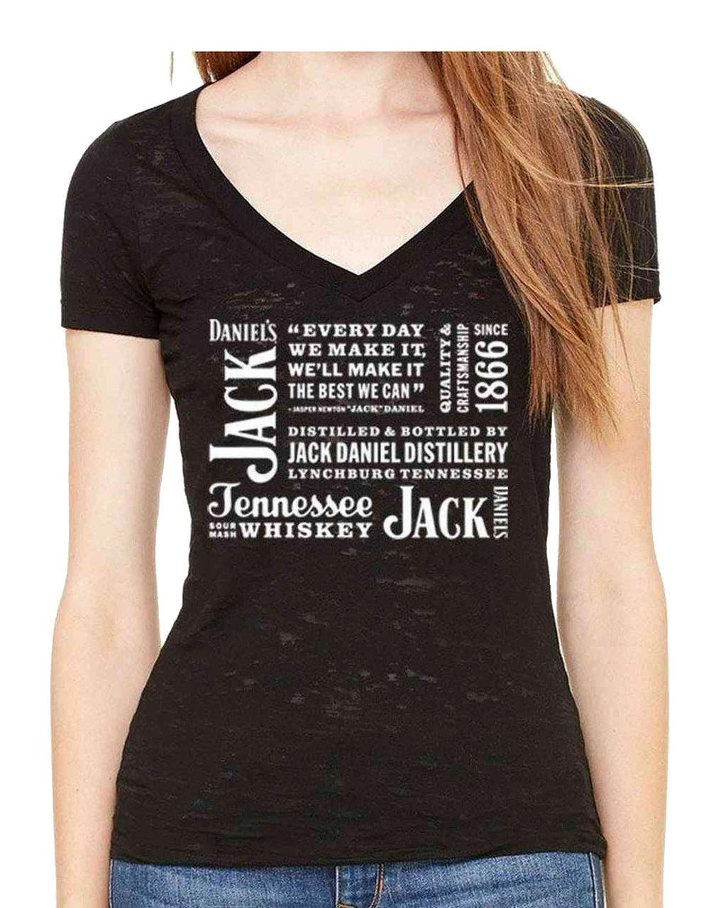 Your Friends at Jack Daniel’s Remind you to Drink Responsibly. Look great at your next event in this stunning V Neck. Black shirt made of Burnout fabric, with classic Jack Daniels graphics and quotes on front. Made in the USA.