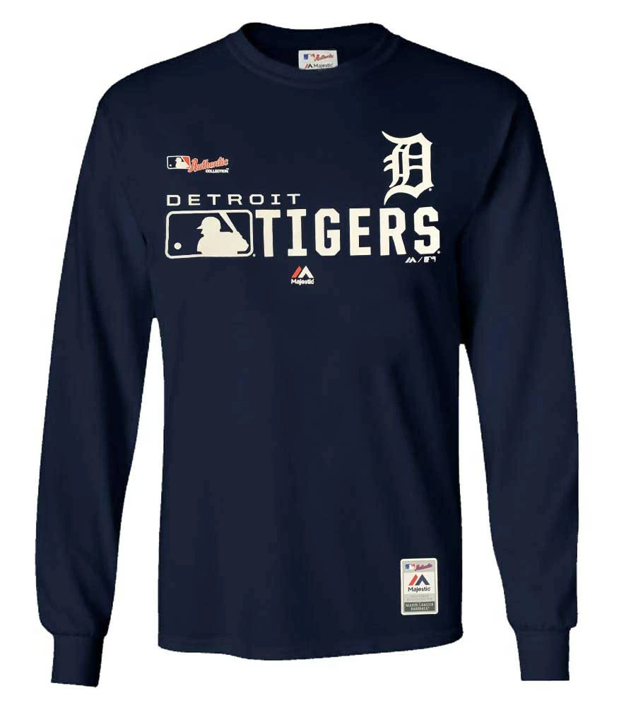 Time to get ready for the Detroit Tigers season with this long sleeve tee for distinction from Majestic. Add this soft and comfortable short sleeve t-shirt to your collection and you’ll always be ready to support your Detroit Tigers. Large Distinction screen print Logo across the front. Majestic brand tee made of 100% Preshrunk Cotton. Officially Licensed by MLB. Color: Navy. AA05-4507-DG-A9K