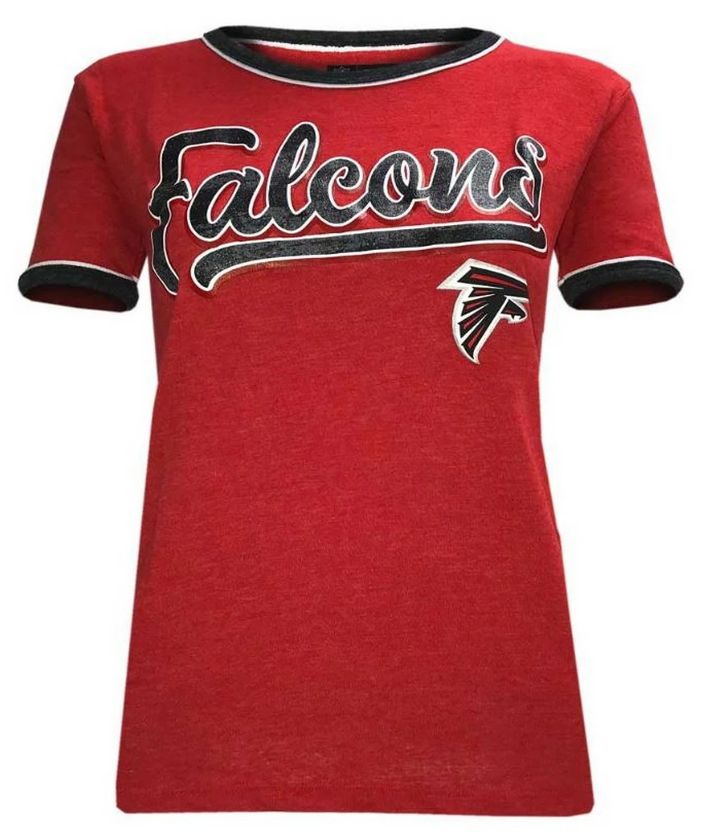 Get ready for the season with this Atlanta Falcons Game Tradition T-shirt from New Era! It features flashy shiny glittery Falcons graphic in black. No hiding your team loyalties with this Tee! Features a triple tone cotton neckline and sleeve detail and fitted cut. Made of 50% Polyester, 37% Cotton, 13% Rayon. Color: Red/Black/White. 11608121