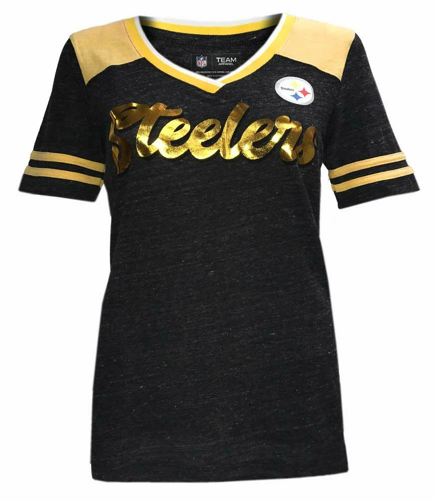 Get ready for the season with this Pittsburgh Steelers Game Tradition T-shirt from New Era! It features flashy shiny Steelers graphic in gold. No hiding your team loyalties with this Tee! Features a ribbed cotton neckline detail and two-tone jersey style. Made of 50% Polyester, 37% Cotton and 13% Rayon. Color: Black/Gold. 11608272