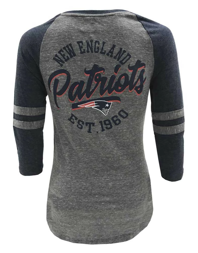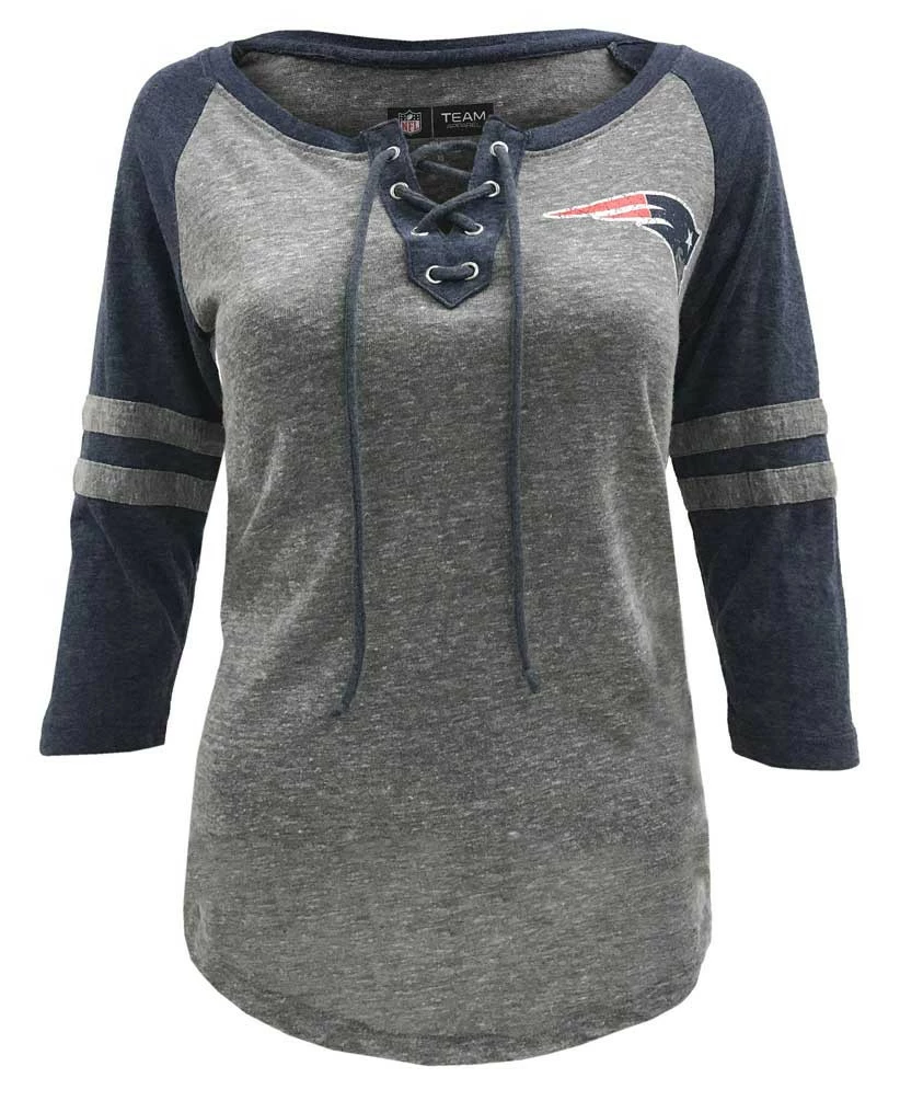 Ladies, get ready for the New England Patriots season with this Women’s Lace-up Tee from New Era. Add this soft and comfortable short sleeve t-shirt to your collection and you’ll always be ready to support your New England Patriots. This t-shirt made by New Era features stand out and a draw string lace up that is sure to show everyone that your devotion runs deep! Made of 50% Polyester, 37% Cotton, 13% Rayon. Officially Licensed by NFL. Color: Gray/Navy/Red. 12051718