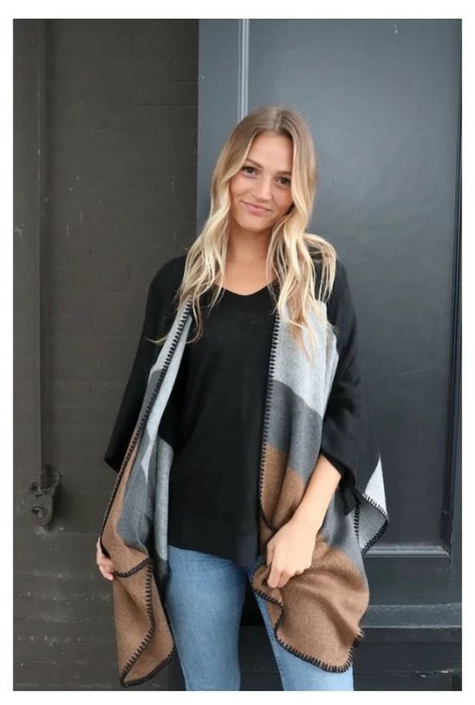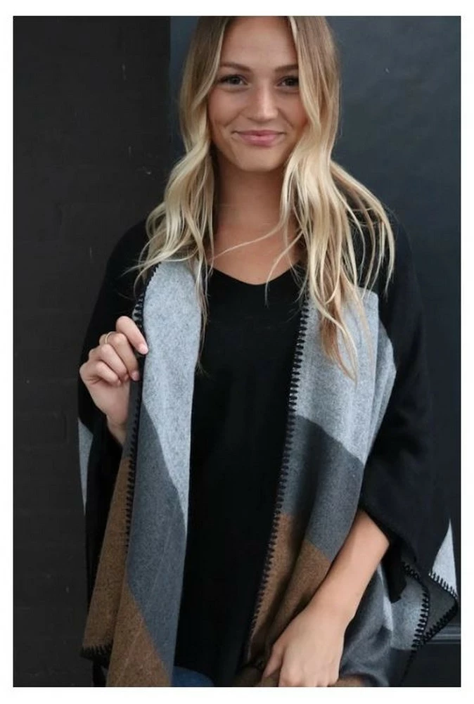 This Striped Cape provides Instant Panache for your favorite pair of jeans and boots! Panache is a wholesale fashion brand that is 100% female owned, located in Minneapolis, MN. This attractive knit cape features 4 large stripes each a different color. Look fashionable while adding that additional layer of warmth during 3 of the 4 seasons. Includes soft comfy fleece lined interior. One size fits most. Color: Grays/Brown/Black. CAPE3