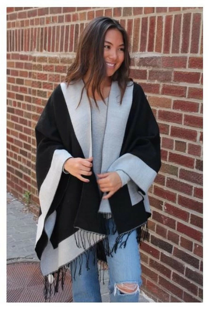 This Gray/Charcoal reversible cape is Instant Panache for your favorite pair of jeans and boots! Panache is a wholesale fashion brand that is 100% female owned, located in Minneapolis, MN. Look fashionable while adding that additional layer of warmth during 3 of the 4 seasons. Includes soft comfy fleece lined interior. One size fits most. Color: Gray/Charcoal. CAPE15
