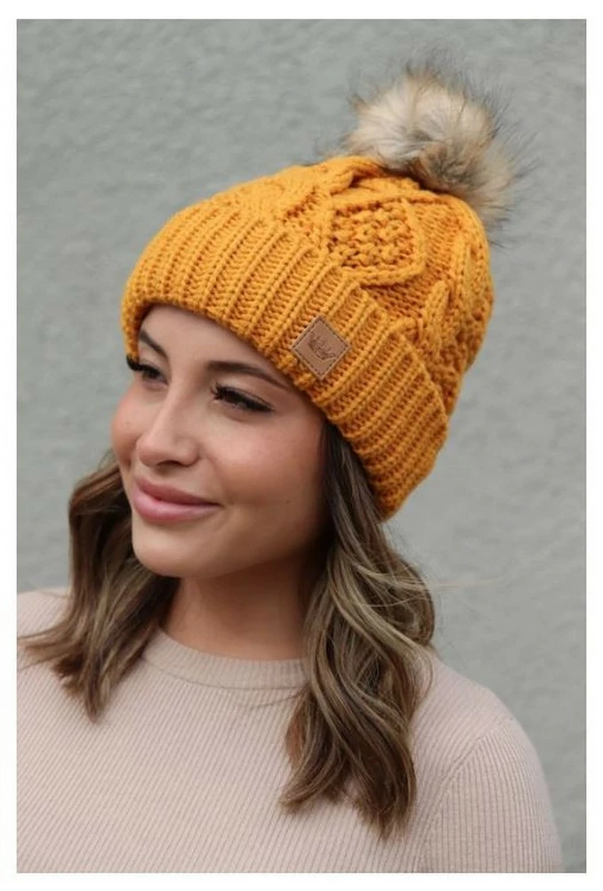 Because everyone deserves to wear a crown. We’re glad you’re here! We are a wholesale fashion brand that is 100% female owned, located in Minneapolis, MN. Women’s cable knitted winter cuffed hat with fur pom pom. This attractive knit features a large braided knit pattern. Stay warm and get noticed at the same time! Includes comfy fleece lined interior. One size fits most. Color: Mustard/Natural Pom. H-76