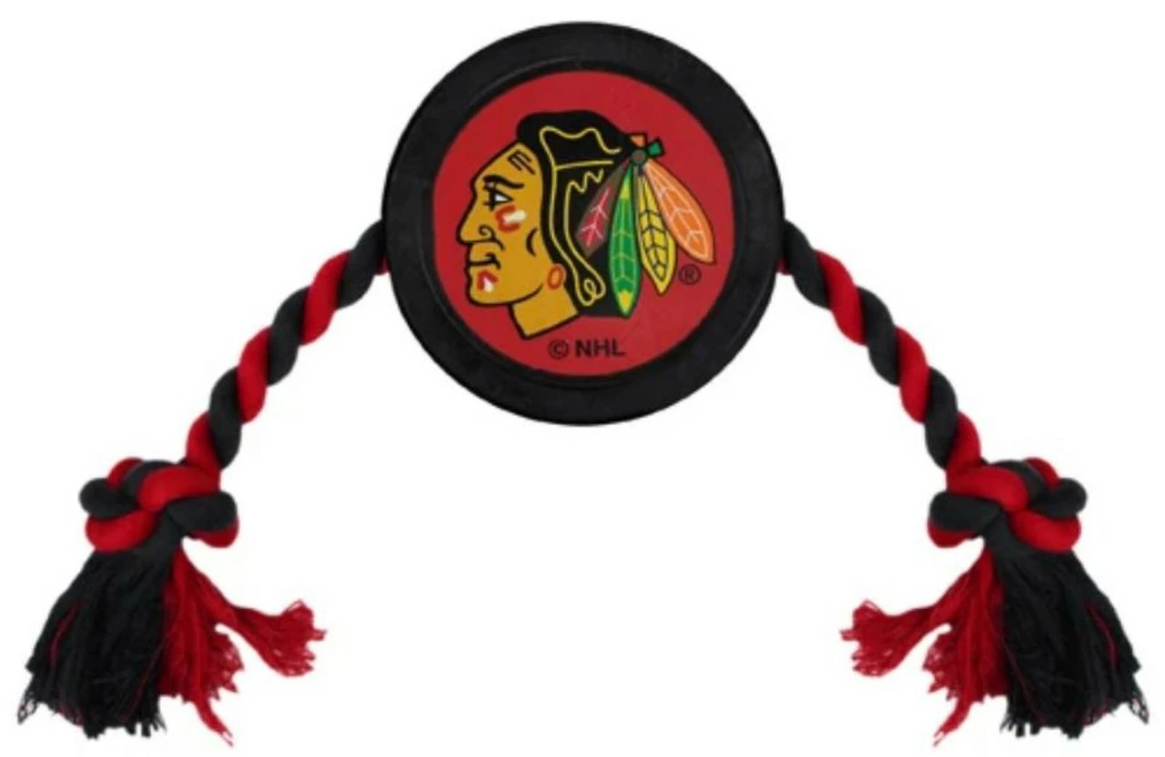 Pets First Chicago Blackhawks Rubber Hockey Puck and Tough Rope Pet Toy, BHK-3233. Officially licensed NHL pet toy. Built for tug, fetch & general fun! Constructed from heavy-duty nylon material and a rubber puck. Team logo featured on front. The two ropes make for an easy game of tug, while the tough rubber puck keeps your dogs entertained and enthused about this new toy. Size: 16? L x 3? W x 1? H