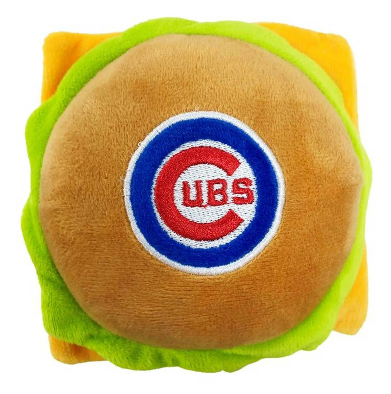 Pets First Chicago Cubs Plush Hamburger Toy, CUB-3353. Get your furry friend ready for gameday! Your furry four-legged friends can enjoy the same stadium concessions that you do! Each toy features a color team logo and is poly-filled with an internal squeaker. This officially licensed toy will provide hours of fun. Size: 5″ x 3″.