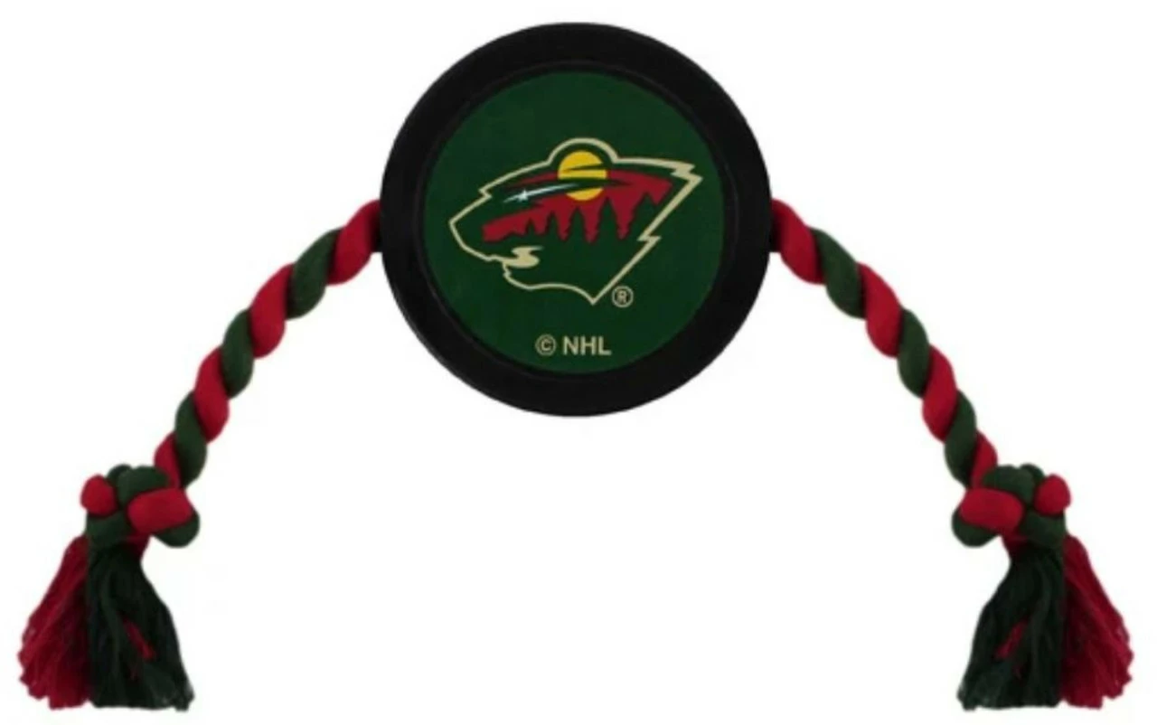 Pets First Minnesota Wild Rubber Hockey Puck and Tough Rope Pet Toy, WLD-3233. Officially licensed NHL pet toy. Built for tug, fetch & general fun! Constructed from heavy-duty nylon material and a rubber puck. Team logo featured on front. The two ropes make for an easy game of tug, while the tough rubber puck keeps your dogs entertained and enthused about this new toy. Size: 16? L x 3? W x 1? H