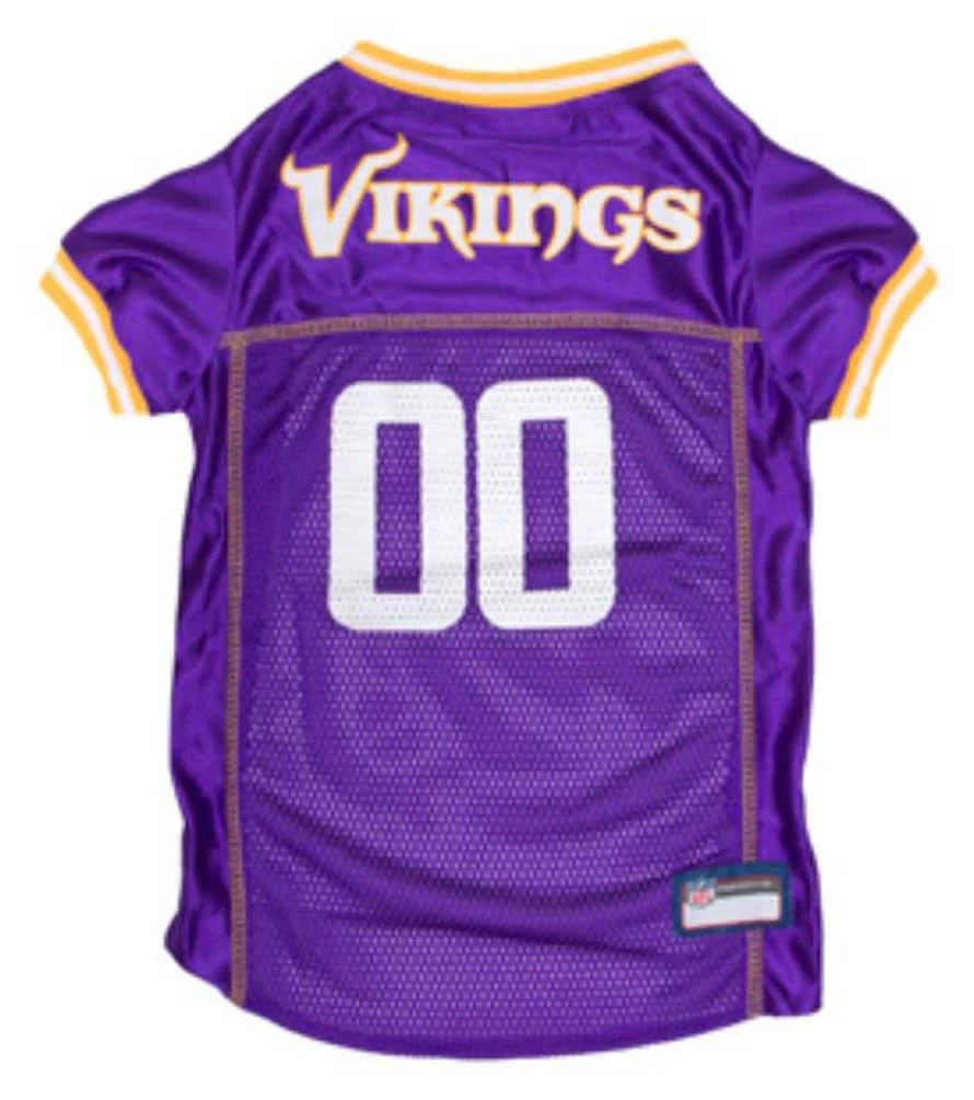 Pets First Minnesota Vikings Mesh Dog Jersey – Purple & Yellow, MIN-4006. Officially licensed NFL pet jersey. Made from 100% satin and poly mesh. Durable fabrics designed for your pets comfort. Features woven trim on neck and sleeves with over lock stitching detail. Back has screen printed logo type, numbers, and woven jock tag. Front has screen printed NFL team logo. Woven NFL shield patch. Perfect for watching football with your four-legged friend. Individual fit may vary. Size chart is a suggested size guide only. Please note that with Team Logo does not appear on front of the XS jersey.
