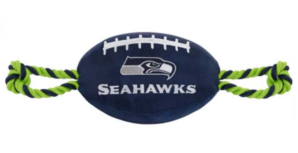 Pets First Seattle Seahawks Nylon Football Dog Toy – Navy & Lime Green, SEA-3121. Officially licensed NFL pet toy. Built for tug, fetch & general fun! Constructed from heavy-duty nylon material with poly-fill. Internal squeaker and team colored rope on both ends. Team logo embroidered on front. The strong rope is great for a game of tug, while the inner squeaker keeps your dog entertained! Size: 12″ L x 4″ W.