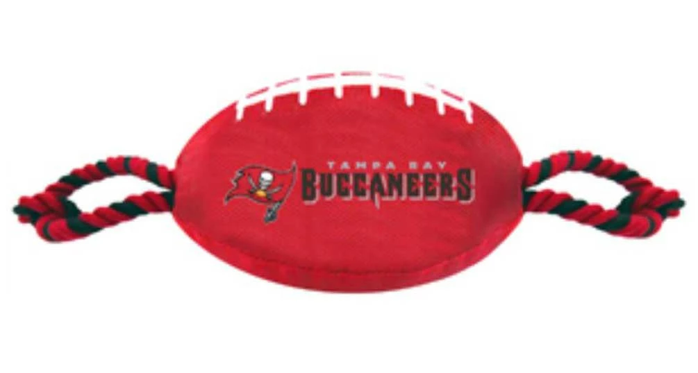 Pets First Tampa Bay Buccaneers Nylon Football Dog Toy – Red & Black, TBB-3121. Officially licensed NFL pet toy. Built for tug, fetch & general fun! Constructed from heavy-duty nylon material with poly-fill. Internal squeaker and team colored rope on both ends. Team logo embroidered on front. The strong rope is great for a game of tug, while the inner squeaker keeps your dog entertained! Size: 12″ L x 4″ W.
