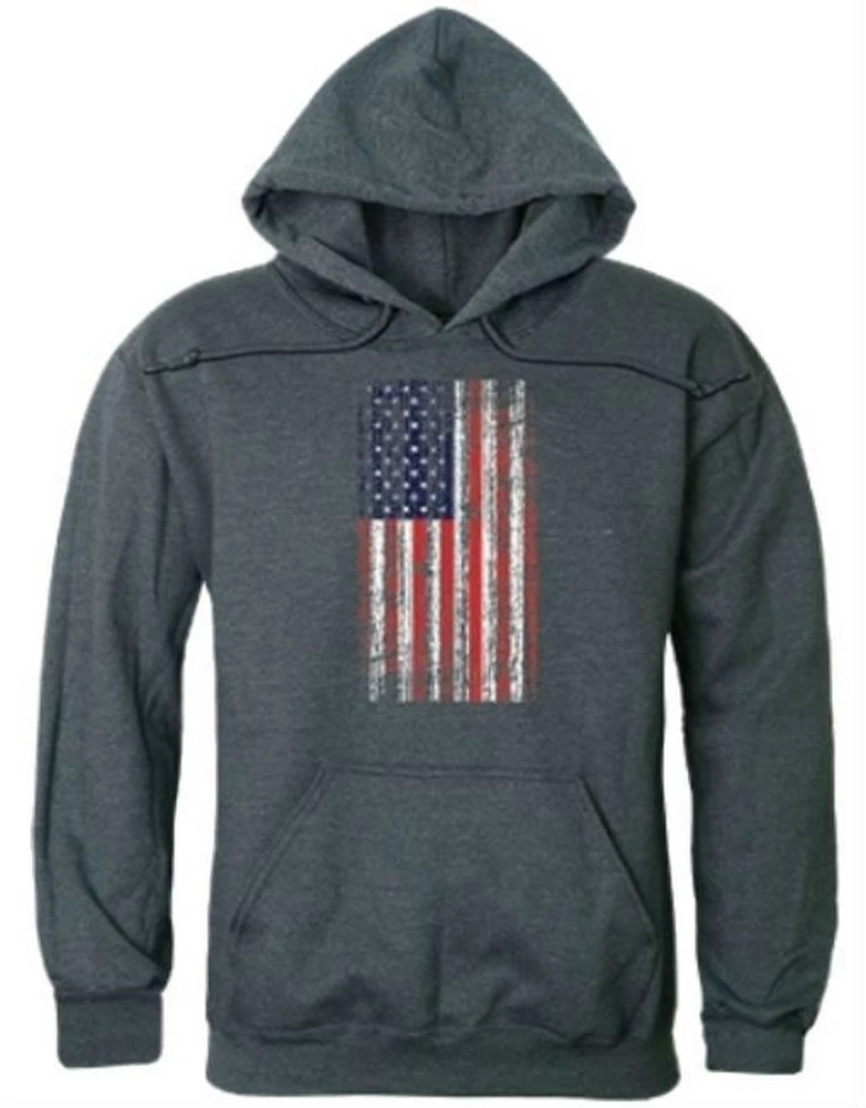 This military tactical hoodie shows your a team player, Team USA! These pullover fleece hoodies are incredibly soft and will give you the comfort and confidence to handle any situation. The front features a distressed virtical USA flag from premium digital graphics and enhanced colorfast characteristics. Has a drawstring hood along with a Kangaroo Pocket. Material: 50% Cotton/50% Polyester. Color: Heather Slate/Red/White/Blue. TS4-800-HCH