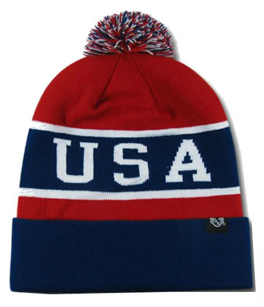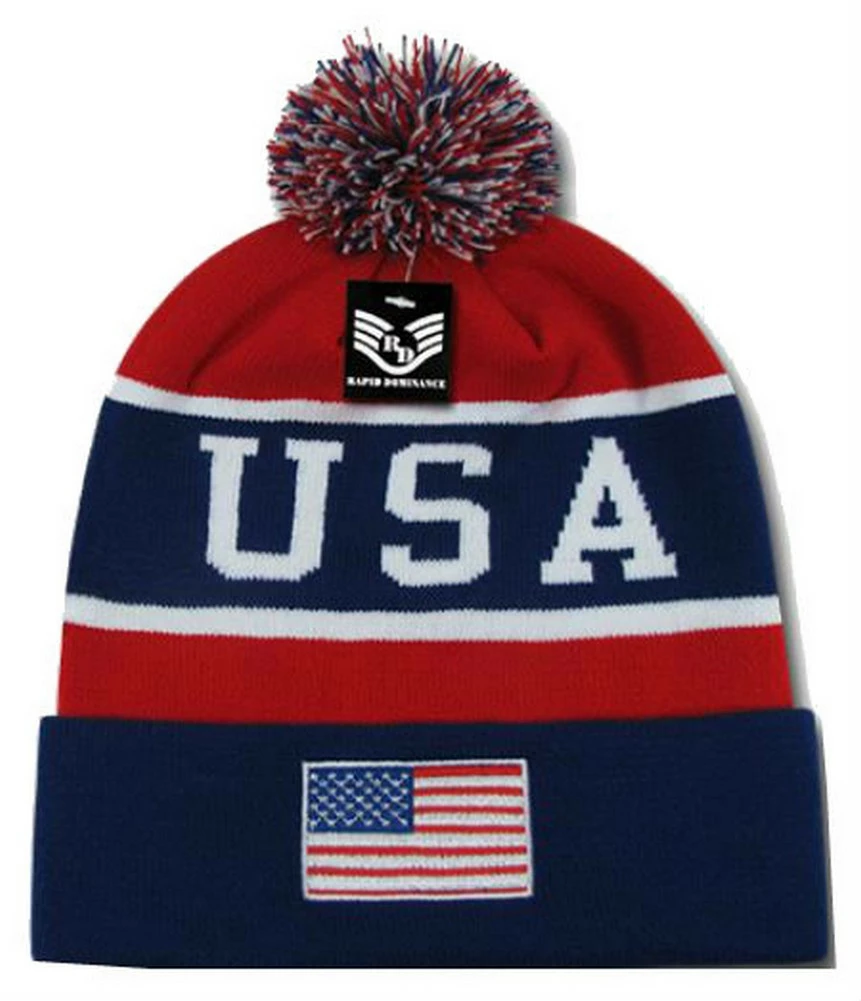 Show your patriotic spirit with our new USA Flag Beanie, this knit cap is a long beanie featuring a embroidery flag on the cuff and USA on the middle of the beanie with a big fuzzy ball atop, this red, white and blue beanie will give you a Fresh and Cool look. this soft beanie hat is great for the winter or everyday wear. features a form fitting design and is made from 100% Acrylic material. Color: Red/White/Blue. R93-USA-NVYRED