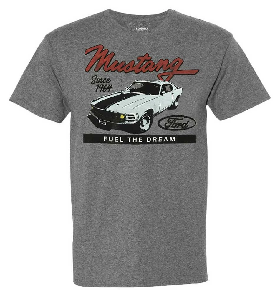 Rex Men’s Ford Mustang Short Sleeve Graphic T-Shirt – Gray, Mustang-Fuel. Ford Official Licensed Product. Distressed Ford Mustang Fuel The Dream screen printed graphic on front. Made from super soft and comfy 50% cotton and 50% polyester. Rib-knit crew-neck that will hold up wash after wash. The perfect graphic tee to add to your collection.