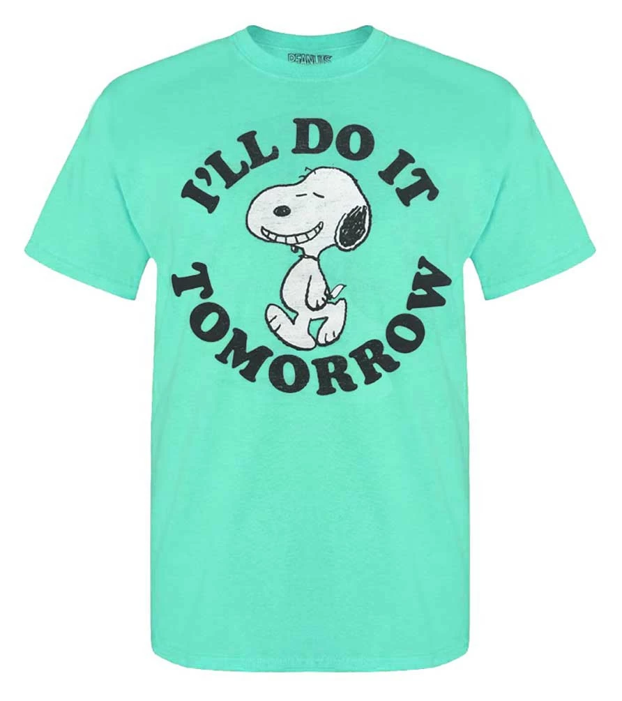 Rex Men’s Peanuts? Short Sleeve Graphic T-Shirt – Teal, Peanuts-Tomorrow. Distressed Snoopy? screen printed graphic with hilarious ‘I’ll Do It Tomorrow’ saying. Made from super soft and comfy 100% cotton material. Rib-knit crew-neck that will hold up wash after wash. The perfect graphic tee to add to your collection.