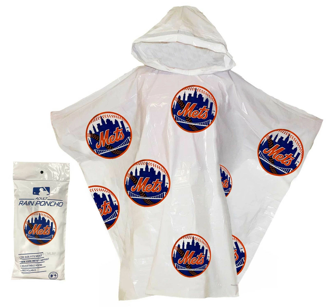 Storm Duds New York Mets Lightweight Stadium Adult Rain Poncho – One Size, 1100-METS. Always be ready for the rain with this lightweight rain poncho. This roomy poncho features an adjustable hood and offers 52� x 80� coverage. White poncho featuring New York Mets logo imprints covering in a scattered pattern. Small packaging allows for easy storage until the poncho is needed, don’t get caught in the rain without one! Officially licensed by MLB. 1100-METS
