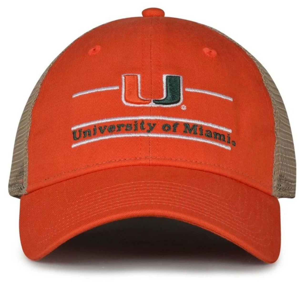 The Game University of Miami Hurricanes ?The U? Logo Split Bar Adjustable Cap ? Orange with Gold mesh, G180-CSP0033. Prove your worth as a University of Miami fan with this awesome Logo Split Bar Trucker adjustable hat from The Game! It’s got four mesh panels along the back for added breathability and embroidered Miami Hurricanes ?U? graphics across the crown. The snapback closure allows for easy adjustments that ensure the perfect fit every time. G180-CSP0033