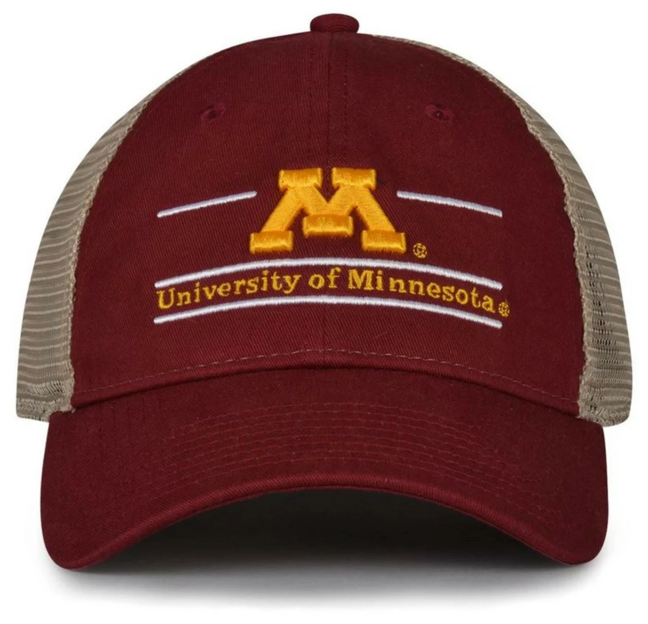 The Game University of Minnesota Golden Gophers ?M? Logo Split Bar Adjustable Cap, Maroon with Gold mesh, G180-CSP0035. Prove your worth as a University of Minnesota fan with this awesome Logo Split Bar Trucker adjustable hat from The Game! It’s got four mesh panels along the back for added breathability and embroidered University of Minnesota graphics and ?M? logo across the crown. The snapback closure allows for easy adjustments that ensure the perfect fit every time. G180-CSP0035