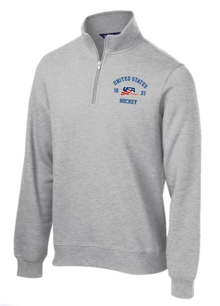 USA Hockeys Performance 1/4 Zip Front Pullover Sweatshirt is so sharp looking. Feel proud wearing our countries colors and feel free to be mistaken for a member of the USA olympic team! The USA Hockey graphics on this gear will let everyone know who you support. In this US Hockey apparel, you will celebrate goal after goal. These durable, colorfast quarter-zips feature a better fit with minimal shrinkage. Features 2×2 rib knit cuffs and waistband. Made of 9-ounce, 65/35 ring spun combed cotton/polyester fleece. Twill-taped neck, 2×2 rib knit cuffs and hem with spandex.