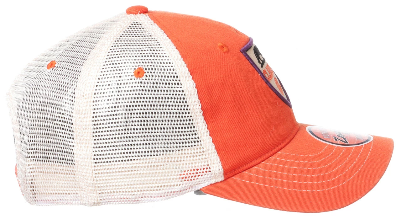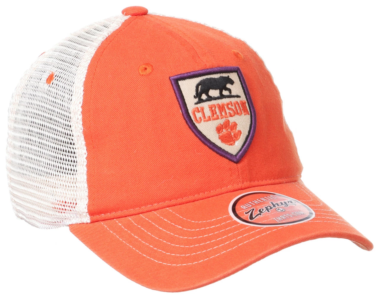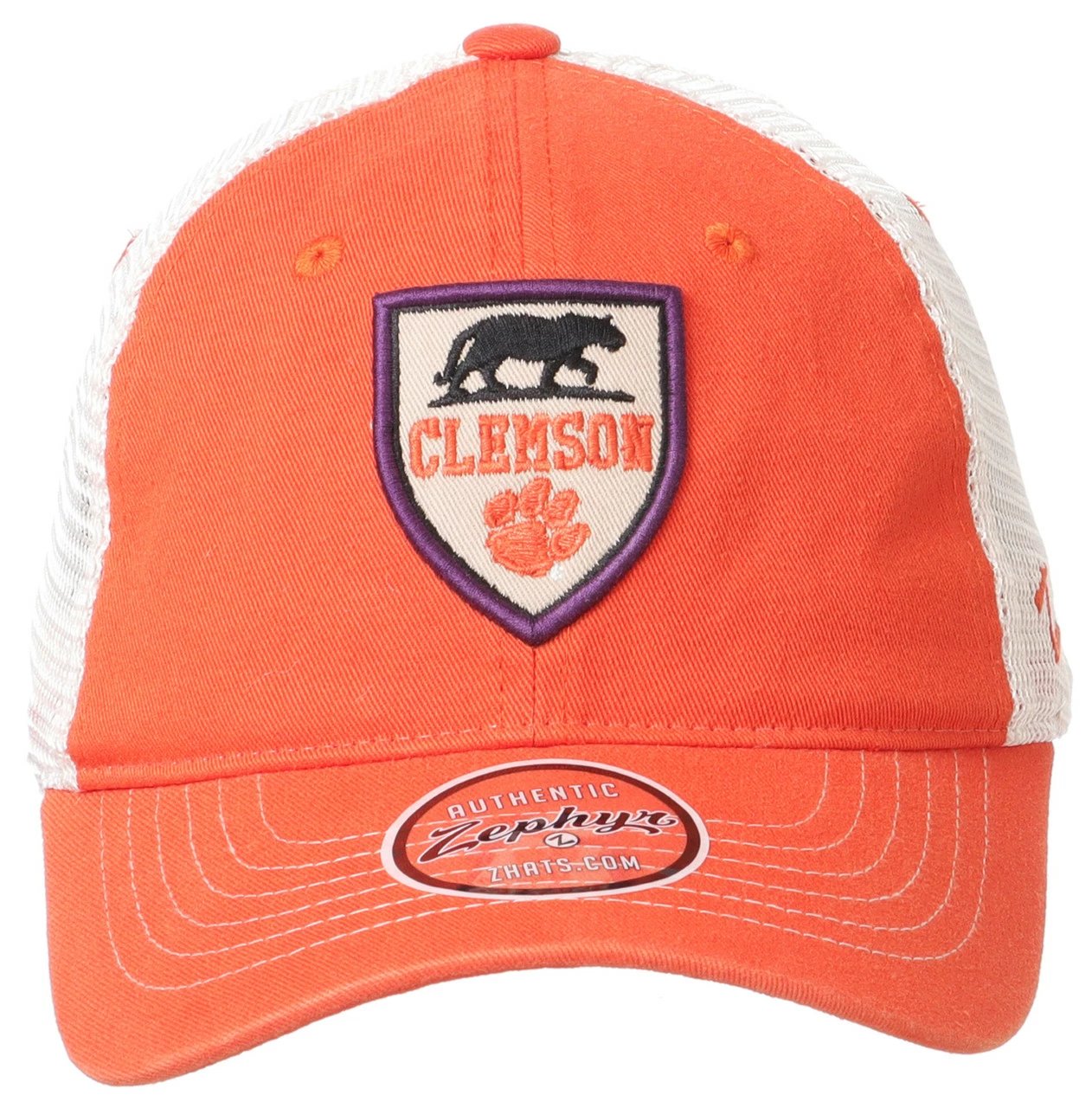 Zephyr Clemson University Guild Unstructured Adjustable Trucker Style Baseball Cap, CLMGID0010. Show your school pride with this comfortable and stylish hat from Zephyr. With a curved brim, six panel construction with contrasting mesh panels and embroidered eyelets for ventilation, this hat is designed for use week after week and game after game! Featuring embroidered team graphics in the Zephyr Guild style logo and a light polyester blend build. Officially licensed, made from 35% cotton and 65% polyester.