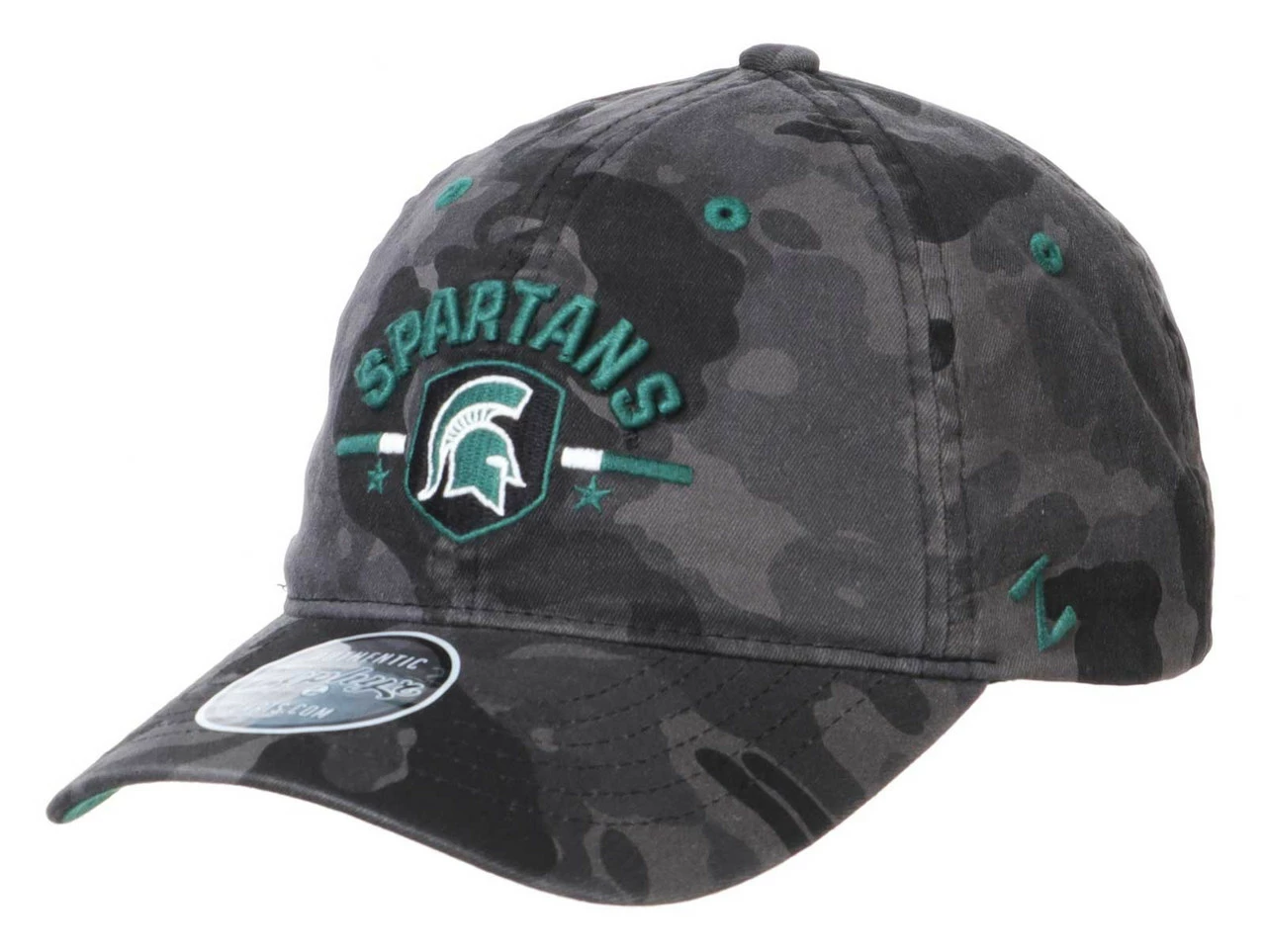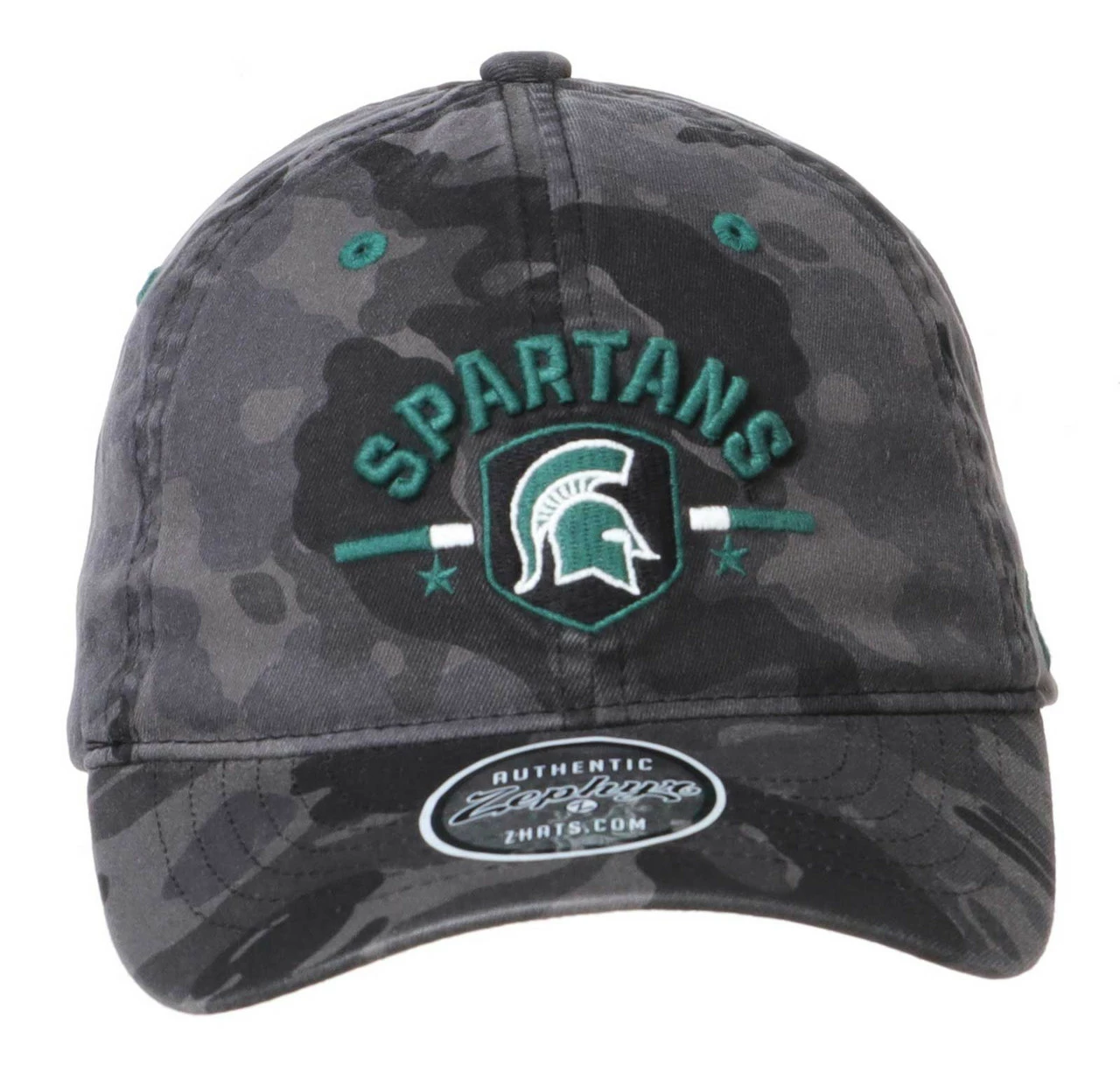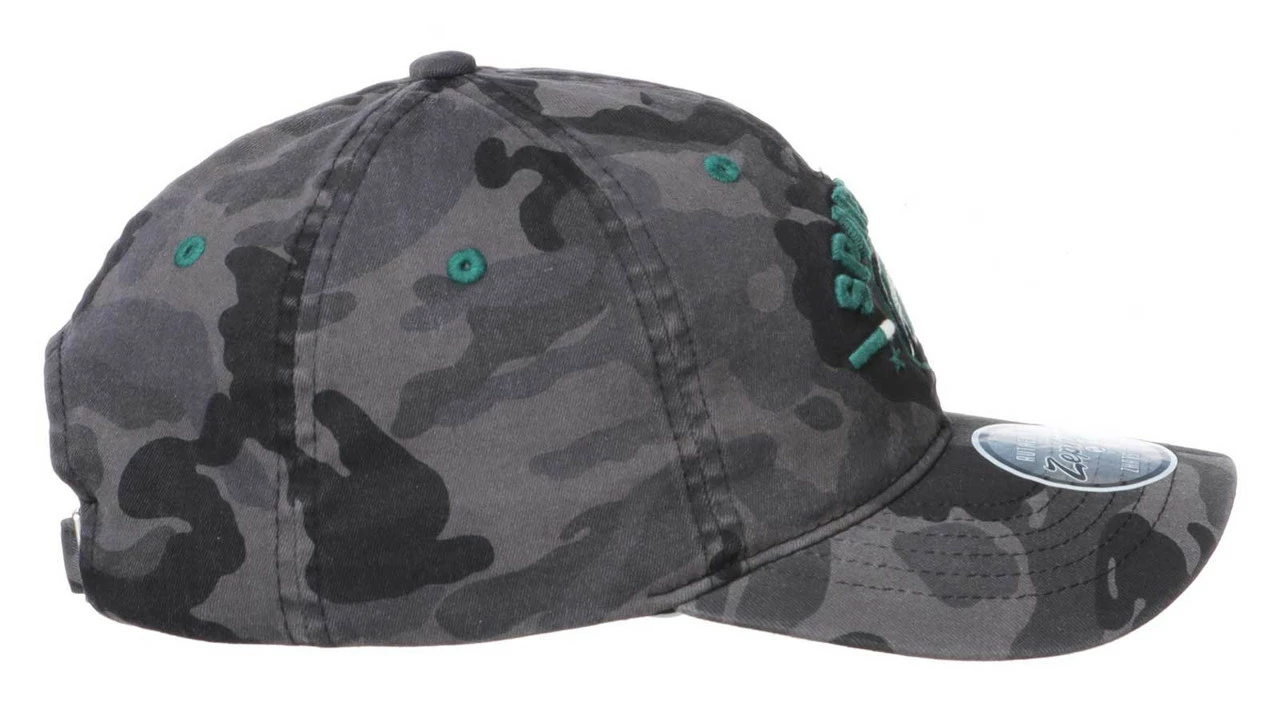 Zephyr Michigan State Spartans Night Patrol Camo Baseball Cap – Black/Gray, MCSNPP0030. Show your school pride with this comfortable and stylish hat from Zephyr. With a curved brim, six panel construction and embroidered colorful eyelets for ventilation, this hat is designed for use week after week and game after game! Adjustable slide closure. Featuring embroidered team graphics with an awesome overall tonal camo pattern. Officially licensed, made from 100% cotton.